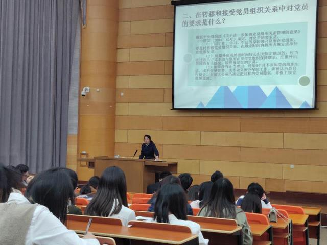 宁晓玲老师围绕党章和《关于进一步加强党员组织关系管理的意见》对毕业生党员进行组织关系管理教育,并向他们详细讲解党员组织关系的重要性、转接党员组织关系的要求和方法,解决各位党员同志在组织关系转接上的相关问题。