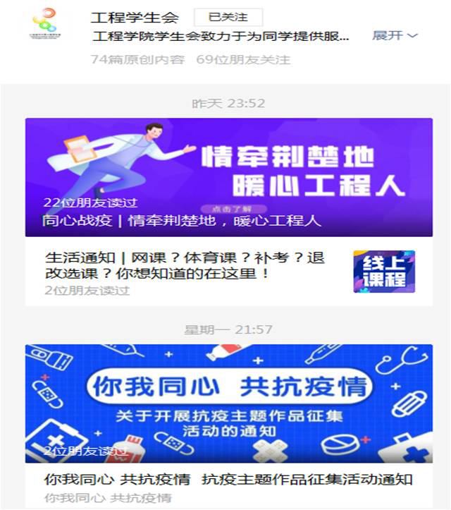 角度开展学生工作。疫情期间,学院学生工作队伍从疫情防护排摸、资助帮扶、心理咨询、抗疫典型宣传、主题教育等多个角度推进疫情时期的学生工作。辅导员通过电话、微信、问卷等对全院每一名学生情况进行梳理排摸,建设学生情况数据表,对每一位因疫情影响的学生做好针对性了解。学院积极开展“抗疫同心·青春同行”线上主题团日和相关主题教育活动,通过线上团员报平安、防疫知识常学习、典型事迹深感悟、勤学互勉树新风、文创作品暖人心、助力防疫齐攻坚等六个方面组织全院各班级团支部开展线上主题团日活动;通过“工程团委”、“工程学生会”公众号平台和“工程权威发布”QQ群平台,建立疫情动态发布机制,并相继推送 “青年说-这场硬仗,我们一定要打”、“致海大工程学子的一封信”等系列推送。学院学生通过参与志愿服务、捐款捐物等形式奉献爱心、支持防疫工作。