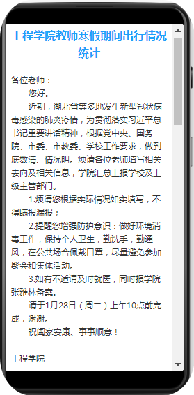 按规定落实防疫要求。根据学校要求,成立学院疫情防控工作领导小组,掌握师生动态,底数清、情况明,开展疫情排查和宣传引导等工作。通过网上调研了解学院96名教师寒假去向,排查重点区域和重点人员,掌握每位老师返程信息,动态跟踪提醒,对返程老师提醒向当地居委报备、自我隔离观察14天等要求;细化学校特殊时期进校申请,制作《教职员工进校申请使用方法》,方便教师通过系统使用申请;同时严格做好教师返校申请的审核,逐一核查,杜绝“四类”人员返校;通过学院微信群,不定期发送疫情防控工作通知、公告、提示等,保持信息通畅,防疫工作不断线;在师生党员中发出交纳“特殊党费”号召,共收到152名党员23748.88元。