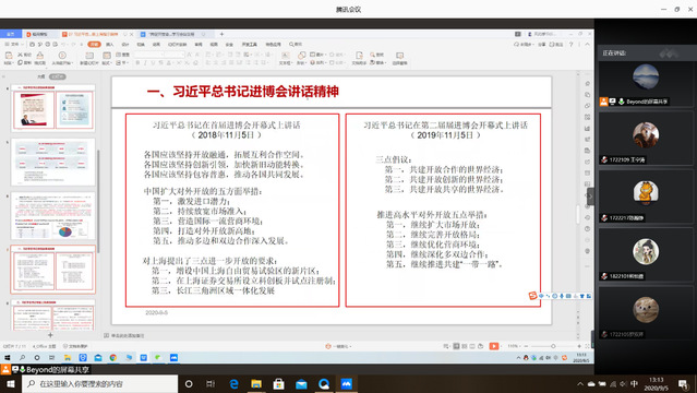 首先,支部书记毕杨意带领党员学习了习近平总书记在第二届进口博览会的讲话精神。我们要深刻学习党和国家在新时代背景下新的对外经济战略,坚持拼搏创新精神不能松懈。我们要充分发展开放型经济,与世界一道努力构建人类命运共同体。会上,支部党员从历史、未来发展、宝贵经验等方面通过文字或PPT的形式进行了发言,分别交流了自己的学习情况和所感所悟
