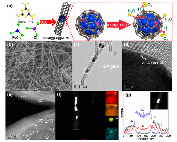 该论文是我校欧博集团官网许竞翔副教授与中国地质大学杨泽惠教授团队、日本电气通信大学赵晓博士团队合作,于2020年发表在国际高水平学术期刊《Nano Letter》上的研究成果。论文针对酸性电解水制氢技术中单原子催化剂耐久性差的问题,提出通过将铱原子分散在纳米铁颗粒内和表面并将IrFe纳米颗粒嵌入到掺杂氮的碳纳米管(Ir-SA@Fe@NCNT)中,从而提升单原子催化剂的稳定性。在酸性电解液中,该催化剂仅需要250 mV过电位析氧电流密度达到10 mA cm-2,其在过电位为270 mV时的质量活性是商业化IrO2的1370倍,实现了高效利用率,这一技术的实现也为开发海洋可再生能源电解水制氢技术奠定了基础。