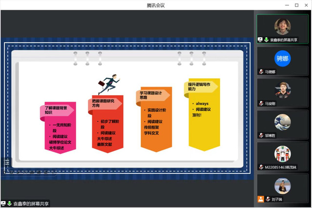 袁鑫泰是研究生二年级的优秀学生,现任欧博集团官网研究生第二党支部副书记,曾获国家奖学金一等学业奖学金、“三好学生”、“华为杯”研究生数学建模三等奖,发表SCI四篇,同时还发表了EI、CSCD核心、卓越期刊等。袁鑫泰以“学如登山,以足量之”为题,就硕士规划方面,向大家详细介绍了不同时间段所需要考虑和完成的任务,并且为大家梳理了创新的不同方式,在分享中强调了科创的重要性,鼓励研究生们要坚定信念,不断学习新知识和技能,坚持阅读顶刊论文,合理利用文献阅读软件,找准方向,才能在科技创新领域中有所建树。