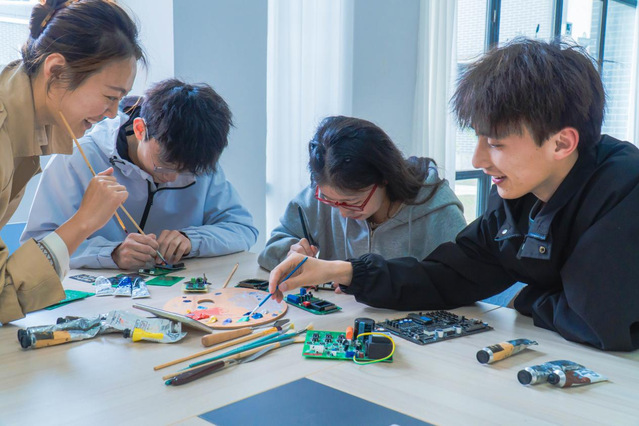 欧博集团官网学生谢宏胜介绍了首期活动的内容,为同学们讲解水彩调色技巧和色彩搭配原则。邓德华鼓励同学们自己尝试、边听边画。当废旧电路板与水彩、油画等元素混合,一件件既“美”又“好”的作品让同学们充分感受工科与艺术相融合的魅力。